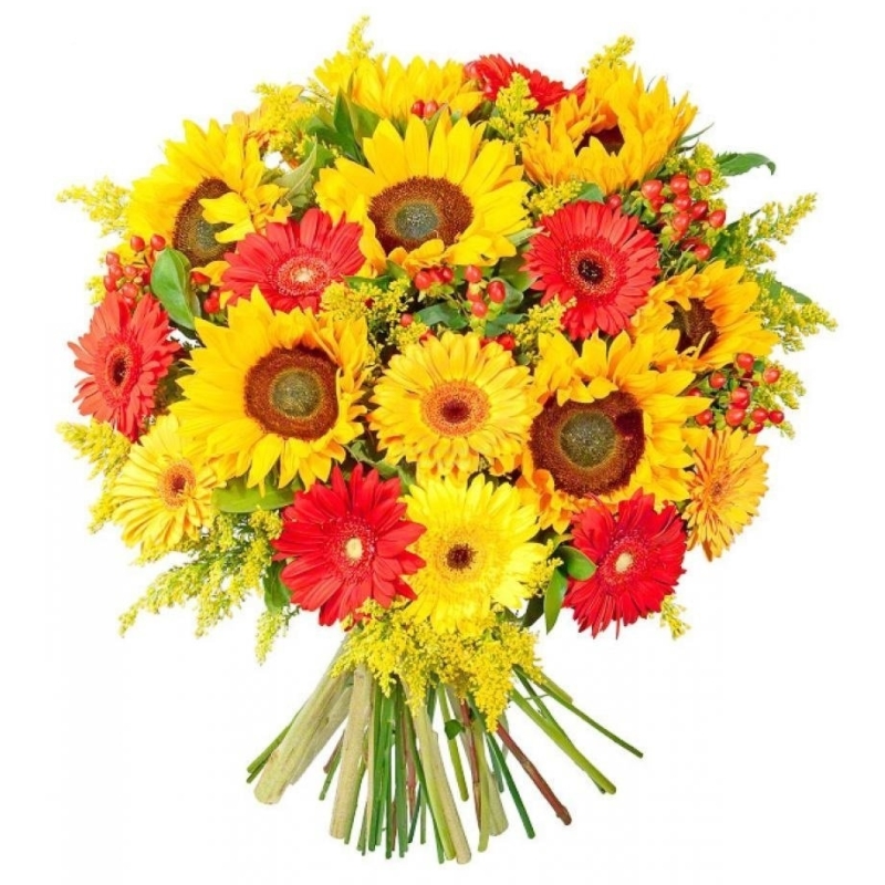 Гербера 11 шт., Гиперикум 7 шт., Подсолнух 7 шт. |