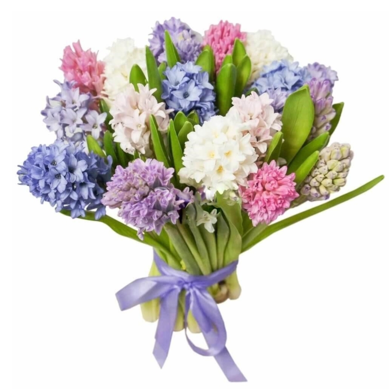Букет состоит из MIX из 19 гиацинтов, прозрачная упаковка, атласная лента.